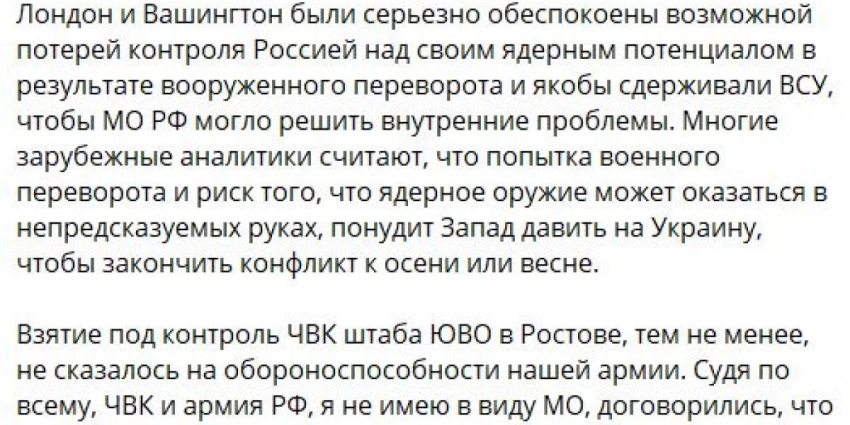 — Сразу же началась масштабная переброска в сторону Артемовска украинских войск, всего того, что осталось от их резервов, подготовленных для большого наступления, — рассказал Крапивник. — Получается, Пригожин в тылу Артемовска создал нашим войскам такую проблему. Это и есть удар в спину. Понимали ли это его парни — я не знаю. Если бы ситуация не разрешилась и они пошли за ним — их жизнь была бы закончена. И их семьи страдали бы тоже, потому что их родственник стал бы предателем.