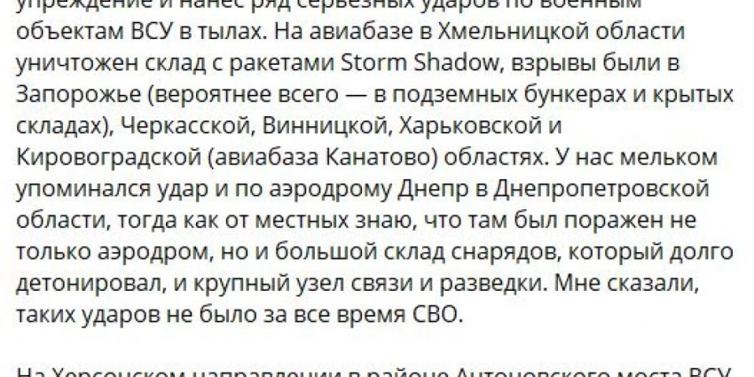 Также в районе населенного пункта Кушугум Запорожской области уничтожен склад боеприпасов 65-й механизированной бригады ВСУ.