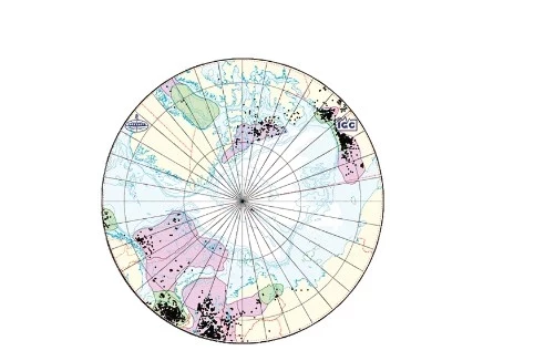 На рис. 7 приведена карта изученности нефтегазопоисковым бурением шельфа и прилегающей суши пяти стран циркумполярного региона, на которой показаны подтвержденные открытыми месторождениями нефтегазоносные бассейны (НГБ) с преимущественно газовой и нефтяной составляющими (розовый и зеленый цвета). Дополнительно на карте показаны три точки неглубокого (до 428 м), но самого северного (широта около 880) бурения на хребте Ломоносова во время экспедиции в 2004 г.
