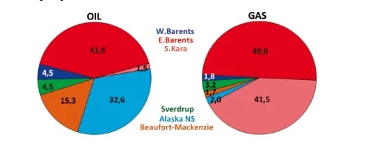 При отнесении оценочных ресурсов (провинций) к ближайшей стране с равным распределением «совместных» нефтегазоносных провинций, по оценкам, на Россию приходится более половины совокупных ресурсов Арктики. В российском сегменте расположены крупнейшие запасы природного газа, в то время как крупнейшие запасы нефти сосредоточены в американском сегменте Арктики (штат Аляска).