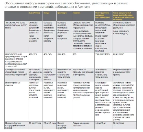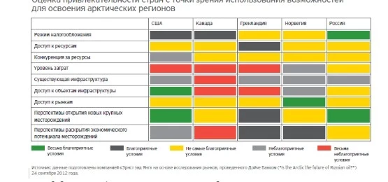 Краткая сравнительная оценка особенностей правовых и налоговых режимов пяти стран и их систем нормативного регулирования, в основе которой лежат результаты исследования, проведённого российской аналитической службой DeutscheBank, позволяет заключить, что Россия будет несколько опережать США и Канаду по степени привлекательности. Это связано с тем, что в России рассматривается возможность введения новой системы налогообложения для проектов, осуществляемых в Арктике. Уровень затрат будет высоким в каждой из стран, но, возможно, чуть ниже он будет в РФ. Проблема отсутствия инфраструктуры также актуальна для всех стран, хотя по критерию доступа к существующей инфраструктуре лучше всего обстоят дела в США, поскольку там функционирует Трансаляскинский нефтепровод. По всей видимости, легче всего будет вывести продукцию на рынки из арктических регионов Норвегии. Наиболее перспективными в плане открытия новых крупных месторождений являются арктические регионы России и США. Однако, по мнению специалистов DeutscheBank, самые широкие перспективы в области освоения месторождений и раскрытия их экономического потенциала существуют в Норвегии и Гренландии. В целом можно отметить, что привлекательнее всего с точки зрения использования возможностей для освоения арктических регионов выглядит Россия, незначительно опережая Норвегию и США.