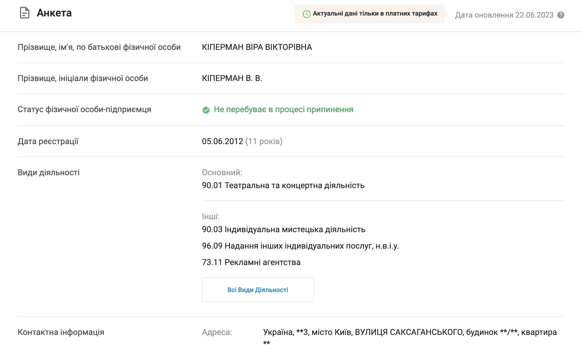 При исследовании украинских реестров юридических лиц, мы нашли несколько записей, связанных с Верой Киперман. В числе них были индивидуальные предприниматели, занимающиеся рекламой и исполнительским искусством, а также пять местных обществ с ограниченной ответственностью (ООО). Из этих пяти ООО, три принадлежат к группе компаний под названием «Инверия», специализирующихся на организации различных конгрессов и выставок.