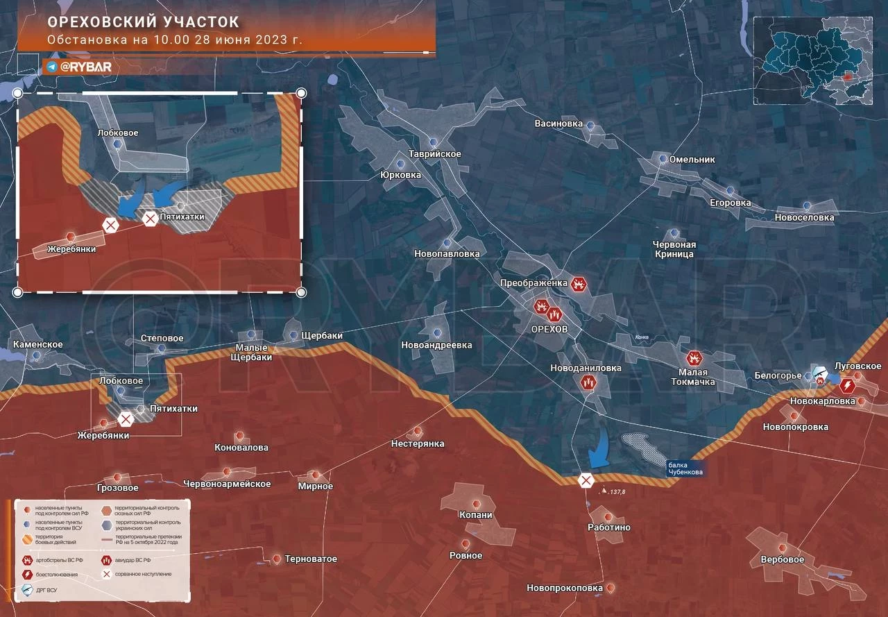 Карта боевых действий: Контрнаступление ВСУ: Ореховский участок обстановка по состоянию на 12.00 28 июня 2023 года