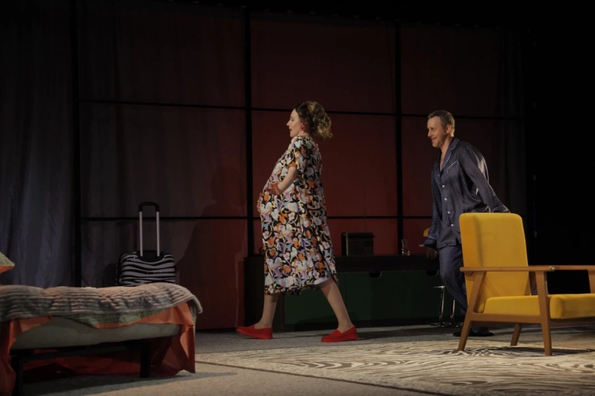 Итак, ритм. Чередование каких-либо событий, происходящее с определенной последовательностью, частотой, скорость протекания, совершения чего-либо. И темп. Скорость протекания того, что задано ритмом. Камертоном того и другого в спектакле, поставленном Николаем Тимошенко в Горьковке, как мне кажется, как раз является сцена родов. Яркая, комическая, даже буффонадная, виртуозная по исполнению. Символизирующая верхнюю точку отношений Джорджа и Дорис (ведь в какой-то мере на свет появляется их общий ребенок). Всё, что было до этого, — разгон качелей до максимально возможной скорости. Всё, что после этого, — постепенное замедление до полной остановки.