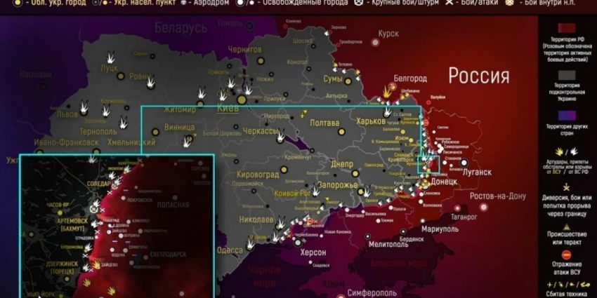 - Быстрый прорыв бойцов ЧВК позволил вклиниться в позиции ВСУ недалеко от бахмутской дамбы и улицы Сосюры. В ожидании обвала фронта украинские военные подтягивают резервы. В район Бахмутского питомника и н. п. Ягодное (15 км до позиций ЧВК Вагнера) переброшены дополнительные силы 26-й артиллерийской бригады.