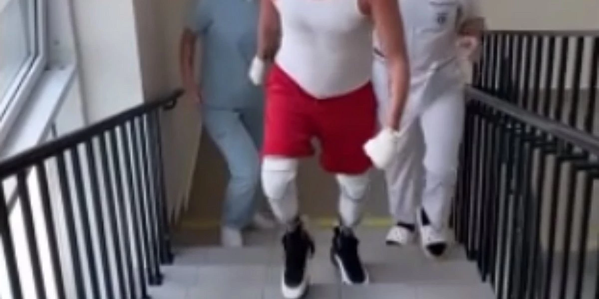 На кадрах видно, как олимпийский чемпион преодолевает пролёт из 13 ступенек, а затем улыбается в камеру. На занятиях в столичной больнице фигуриста поддерживают два специалиста по лечебной физкультуре.
