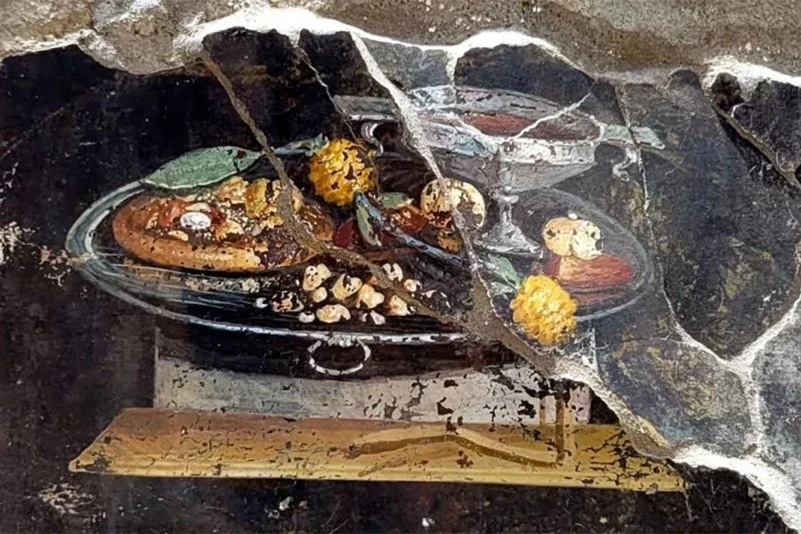 При раскопках квартала домов в Районе IX в Помпеях была обнаружена настенная роспись с изображением натюрморта с едой и напитками, на котором изображено то, что очень похоже на пиццу. Это, конечно, не пицца, поскольку помидоров и моцареллы в Италии даже не существовало, когда фреска была написана 2000 лет назад.
