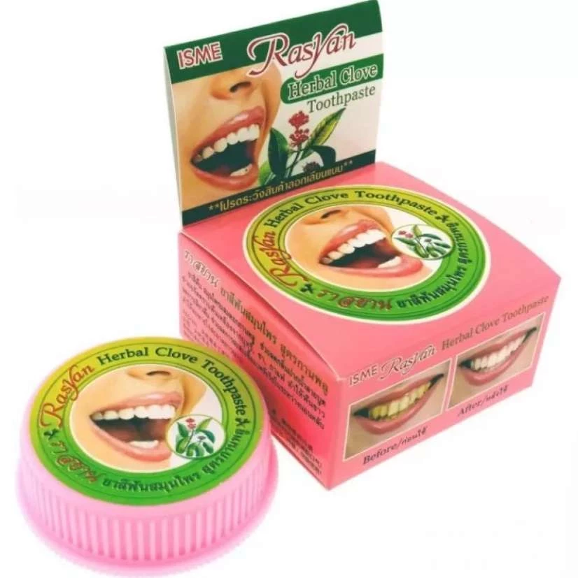 Зубная паста ISME Rasyan — тайская находка для тех, кто ценит натуральные продукты и ищет отбеливающий эффект, устранение неприятного запаха изо рта и борьбу с зубным камнем в одной упаковке. Эта паста рекомендована для ежедневного использования и заслуженно пользуется популярностью, особенно среди тех, кто побывал в Тайланде и оценил её там. Упаковка ISME Rasyan выгодно отличается от традиционных зубных паст на российском рынке. Она представляет собой небольшую плоскую баночку, а в комплект входит мерная ложечка для удобного нанесения пасты на зубную щётку. Такой метод использования позволяет сэкономить исключительно много пасты, делая продукт очень экономичным. Основные компоненты зубной пасты ISME Rasyan — это натуральные ингредиенты. Масло гвоздичного дерева играет ключевую роль в составе, придаёт пасте уникальные характеристики. Кроме того, в неё входят ментол и камфора, которые придают ощущение свежести после использования.