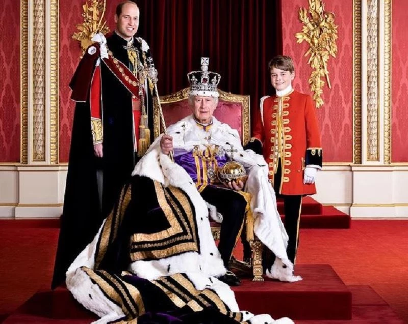 На фотографии, сделанной фотографом Хьюго Бернандом в Тронном зале Букингемского дворца, король Великобритании Карл III запечатлён, сидящим в кресле с короной Святого Эдуарда. Образ монарха дополнила мантия, а также скипетр с державой. На правой стороне от верховного главнокомандующего расположился его старший сын Уильям, а с левой – его внук, принц Джордж. Принц Уэльский был облачён в парадную форму, а Джордж в форму почётного королевского пажа, роль которого исполнял во время коронации короля.