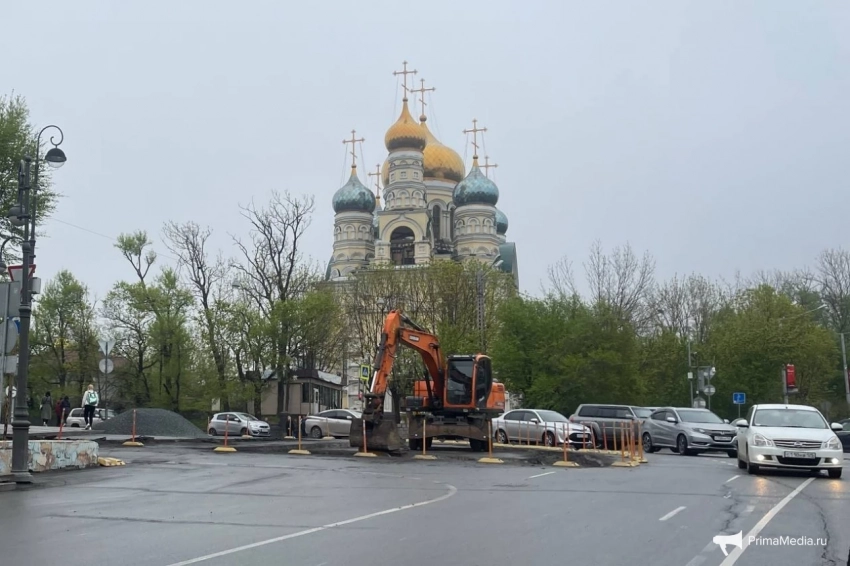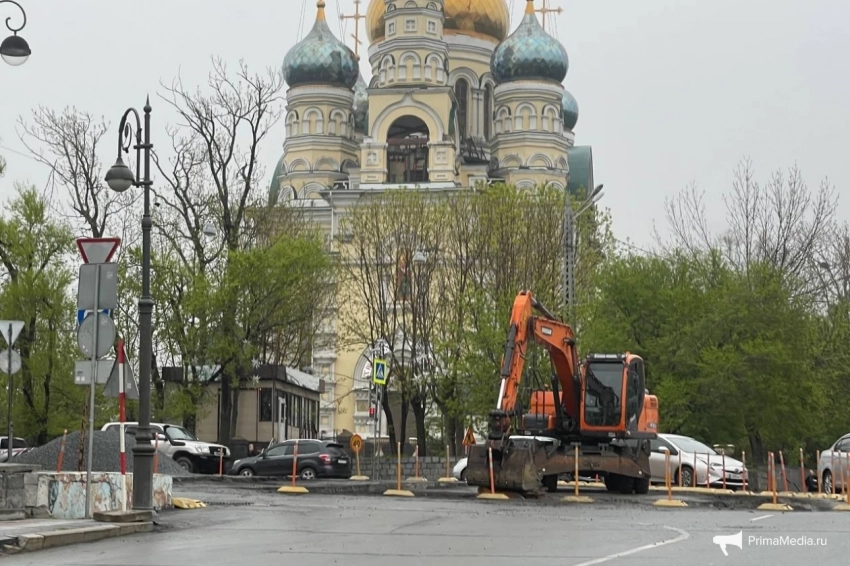 В районе Покровского парка во Владивостоке сносят делиниаторы и строят тротуар. Фото: ИА PrimaMedia