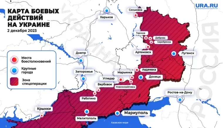 Ранее наш сайт N4k.Ru опубликовал свежую карту боевых действий на Украине по состоянию на 12:00 мск от 02.12.2023.