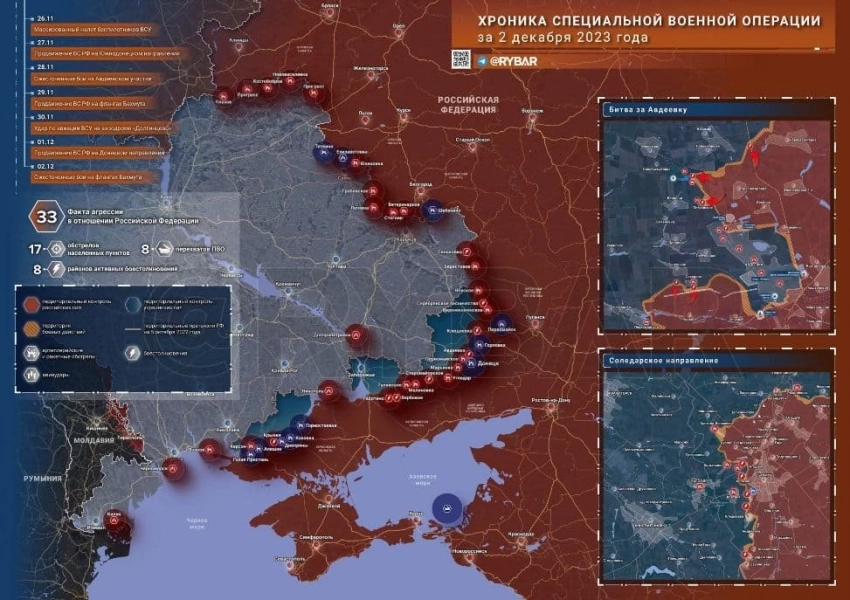 Карта боевых действий в зоне СВО на Украине по состоянию на 3 декабря 2023