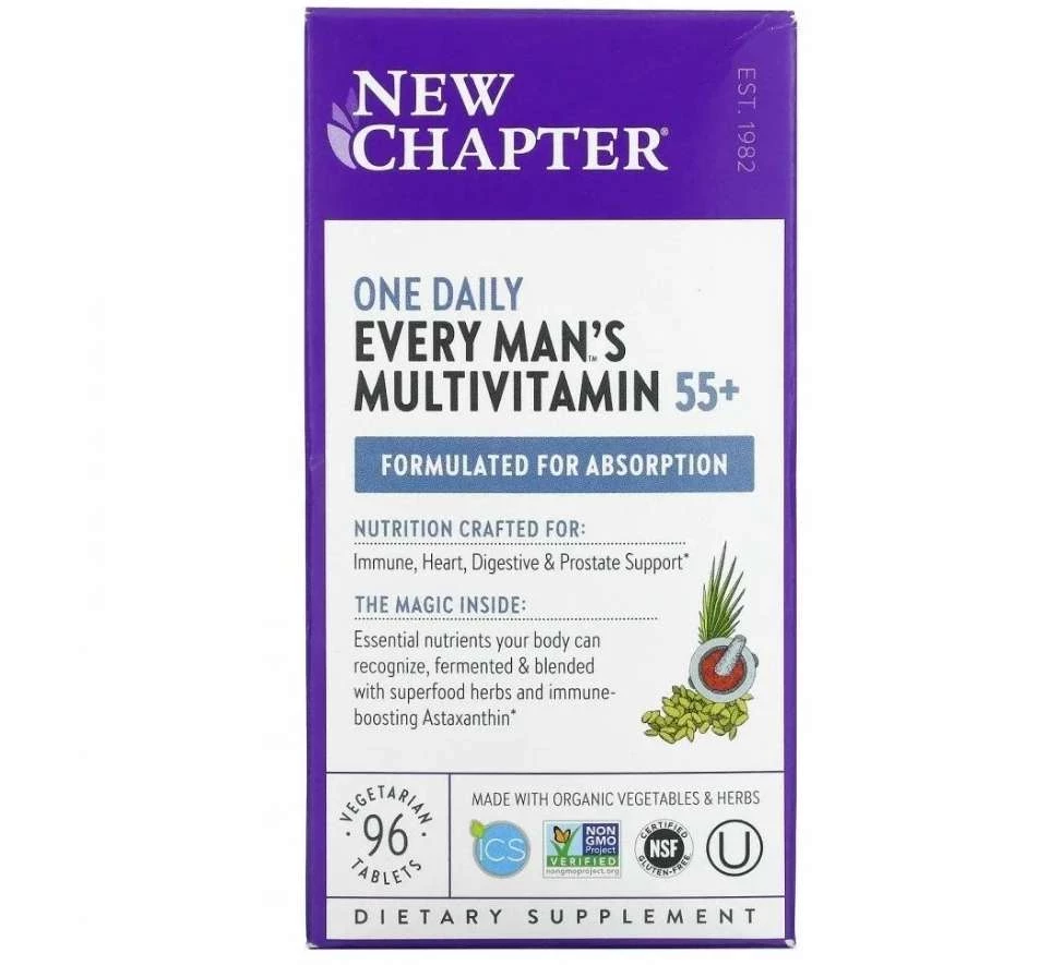Витамины для мужчин New Chapter специально предназначены для мужчин старше 55 лет. Их особый состав разработан для обеспечения более эффективного усвоения. Он изготовлен только из органических овощей и трав. Весь процесс производства сертифицирован организацией ICS, гарантирующей высокое качество. Также, этот продукт имеет сертификат Non GMO Project Verified, подтверждающий отсутствие ГМО-составляющих. И, конечно, он не содержит глютена, подтвержденного сертификатом NSF, что делает его безопасным для употребления аллергиками и лицами, страдающими целиакией. Кроме того, он является кошерным продуктом, отвечающим специальным требованиям и ритуалам кашрута.