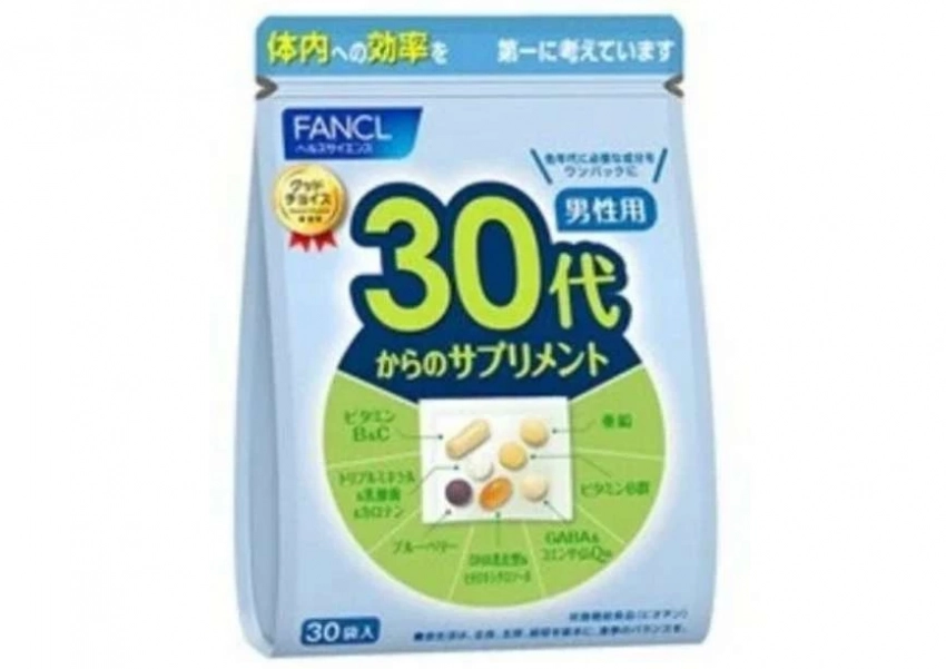 Вошли в наш топ витамины для мужчин старше 30 Fancl. В состав пакетика входят важные для организма витамины и минералы, такие как витамины A, D, E, В1, В2, ниацин, B6, фолиевая кислота, B12, биотин, пантотеновая кислота, витамин C. Также присутствуют кальций, магний, цинк, инозитол, витамин Р и коэнзим Q10. Эти компоненты необходимы для поддержания нормального функционирования организма, укрепления иммунной системы, улучшения состояния кожи, волос и ногтей, поддержания здорового сердечно-сосудистого и нервной системы. Пакетик предназначен для повышения общего тонуса и здоровья.