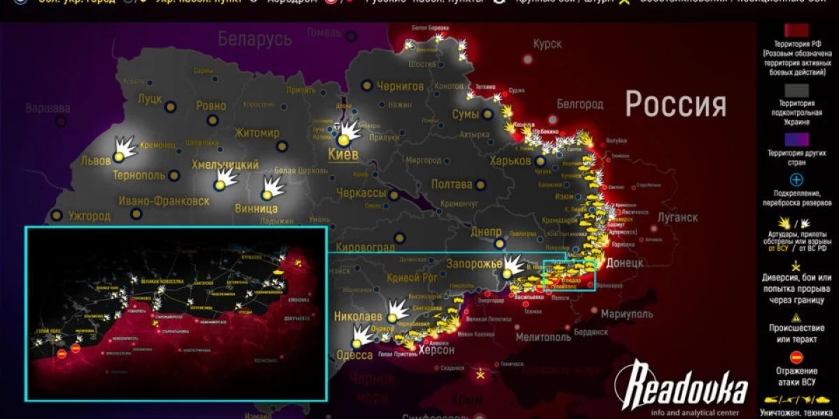 В Запорожской области ВСУ попытались наступать возле населенных пунктов Новоданиловка и Яблоково и выдвинуть резервы в направлении Лобкового и Каменского, но по колоннам, а также по скоплению живой силы и техники в районе населенного пункта Белогорье, российские войска нанесли удары. Источник