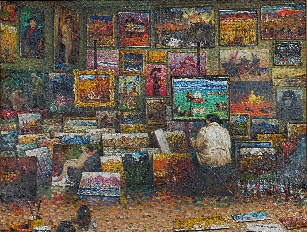 “Над картинами дедушка работал подолгу, — рассказала Мария, — ведь его техника подразумевала многослойность. Он писал чистыми красками, брал максимально звонкие, “открытые” цвета и накладывал их на хост маленькими точками. Когда смотришь на такую картину с большого расстояния, два цвета смешиваются оптически и образуют третий цвет”.