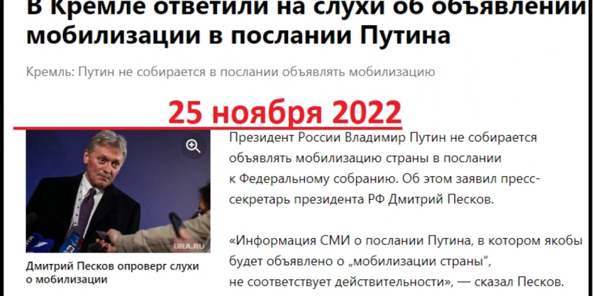 Пресс-секретарь президента РФ Дмитрий Песков, который комментирует и объясняет решения главы государства, заявил о том что никаких мобилизационных мероприятий военкоматы не производят, а сама мобилизация была завершена.