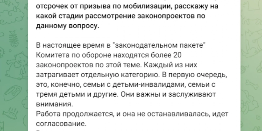 «В настоящее время в «законодательном пакете» комитета по обороне находятся более 20 законопроектов по этой теме (отсрочек от призыва по мобилизации). Каждый из них затрагивает отдельную категорию. В первую очередь, это, конечно, семьи с детьми-инвалидами, семьи с тремя детьми и другие», — написал депутат.