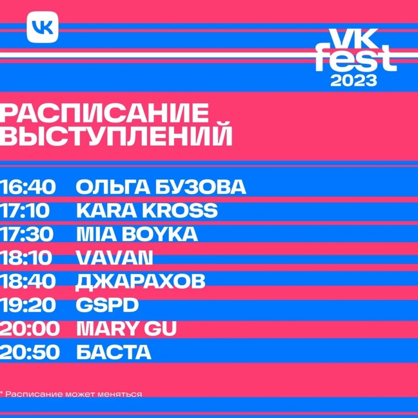 В 2023 году VK Fest станет самым громким развлекательным событием лета: он будет длиться целый месяц и пройдёт в пяти городах страны. Во Владивостоке фестиваль состоится 17 июня, в Новосибирске — 24 июня, в Санкт-Петербурге — 1 и 2 июля, в Сириусе (Сочи) — 8 июля, в Москве — 15 и 16 июля. Билеты на событие доступны на официальном сайте: vkfest.ru.