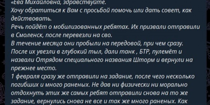13 февраля 2023 года Ева Меркачева, член Совета по правам человека при президенте РФ, сообщила, что к ней обратились мобилизованные из Смоленска с жалобой на неадекватные действия командования. Меркачева поделилась их обращением в своем Telegrtam-канале.
