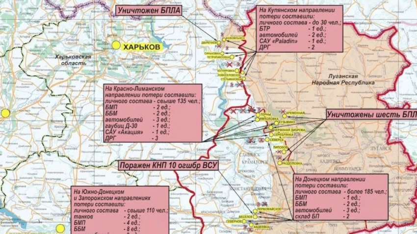 На Ямполовском, Торском участках и в районе Серебрянского лесничества силами и средствами разведки вскрыто перемещение взводов на боевых бронированных машинах 21, 42 и 63 механизированных бригад ВСУ. В результате нанесения ракетного удара штурмовой и армейской авиации, а также артиллерии группировки «Центр» противник понес значительные потери в личном составе и технике.