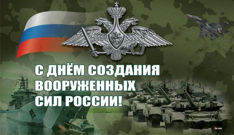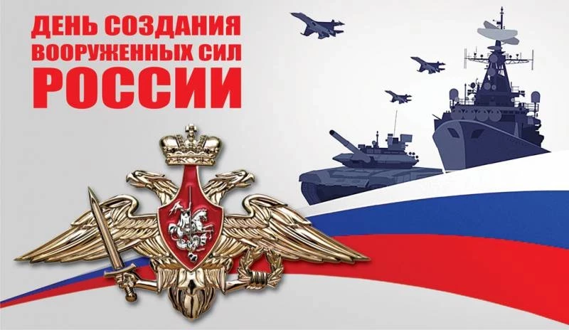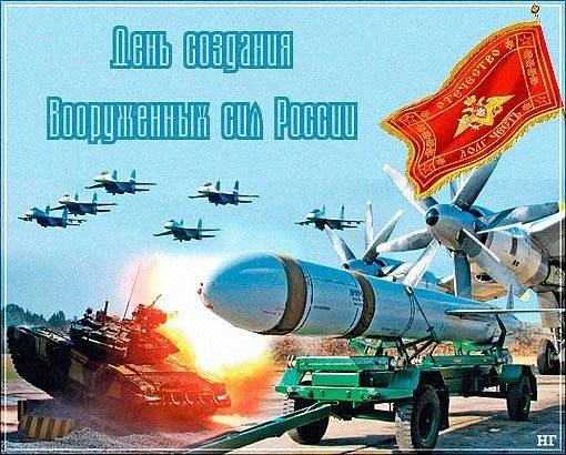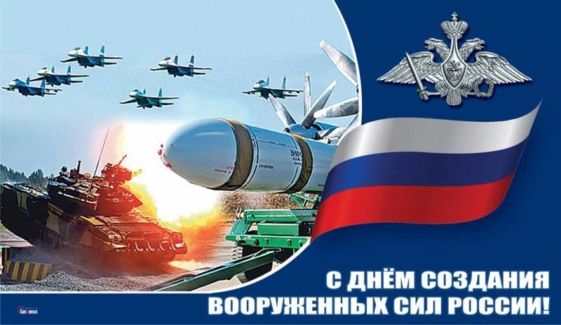 Всех, кто имеет отношение к вооруженным силам РФ, поздравляем с праздником, с днем, когда вооруженные силы были возданы. Пусть ваши старания по защите нашей родины никогда не будут забыты и всегда оцениваются высоко, пусть память о героях прошлого согревает наши сердца и дарит веру в светлое будущее.
