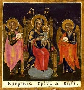 Кипрская икона Божией Матери была обретена в 392 году на острове Кипр, и продолжает там находиться. С нее есть списки, которые можно видеть в Николо-Голутвинской церкви Московской области.