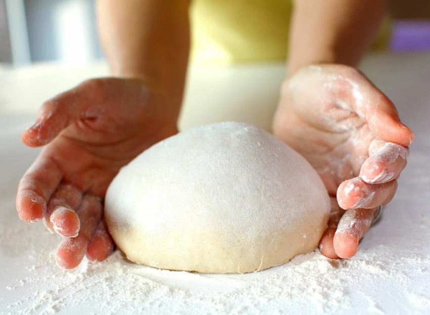 Начните замешивать тесто руками, постепенно вводя муку и разрыхлитель. Продолжайте замешивать до тех пор, пока тесто не станет эластичным и перестанет прилипать к рукам.