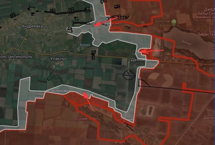 На Константинопольском направлении ВС РФ давят в направлении Андреевки с востока и северо-востока, ведут штурмовые действия в Дачном, продвинулись на северо-восточной окраине на глубину до 800 метров.