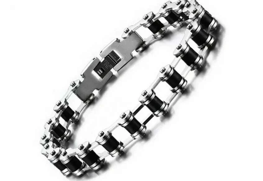 Брутальный и красивый мужской браслет из нержавеющей стали. Отлично подойдет под любой стиль и образ. Браслет имеет черные вставки из каучука, что добавляет премиальность его внешнему виду. Браслет мотоциклетная цепь — надвигающийся тренд 2023 года.