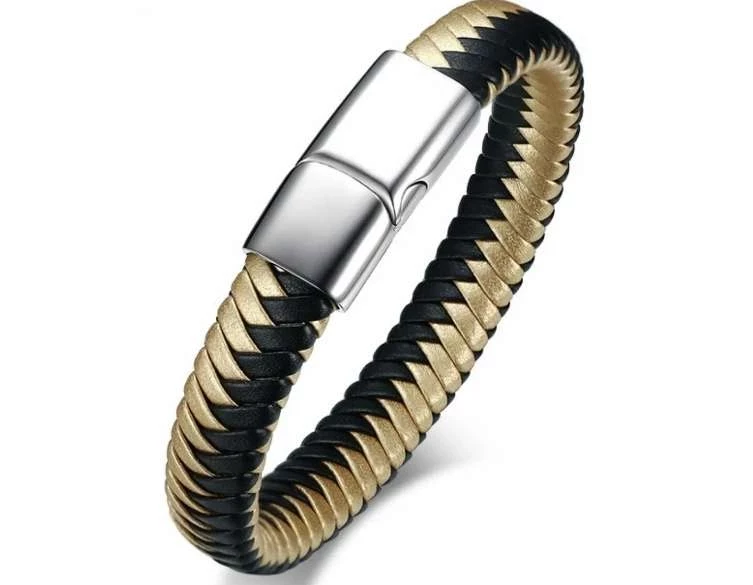 Мужской браслет черно-золотой выполнен из кожи со стальным замком. Браслет для мужчин станет прекрасным завершением стильного образа. Яркий дизайн трендового аксессуара подчеркнет индивидуальность и сильные мужские руки, ненавязчиво добавит выразительности, статусности, смелости и отважности. Браслет на руку универсальный, современный, будет приятно и комфортно носить его как с деловым костюмом, так и в неформальной одежде.