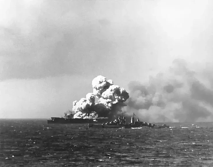 У японцев, корабли которых не уступали американским, в принципе, история схожая. «Кага» — 5 прямых попаданий бомбами. «Хирю» — 4 бомбы 454-кг и две своих торпеды. «Амаги» — 1 прямое попадание, но многочисленные разрывы бомб у бортов вызвали расхождение швов, и авианосец затонул.