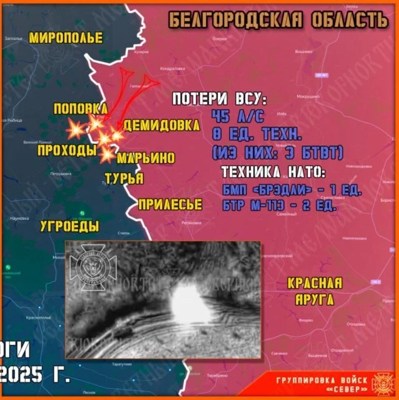 Наши штурмовики продолжают зачистку Демидовки, Поповки и приграничных лесных массивов, где укрываются разрозненные группы противника. Отдельные ВСУшники самовольно пытаются сбежать на территорию Сумской области, однако все пути отступления контролируются Северянами, которые уничтожают оккупантов, отказавшихся сложить оружие.