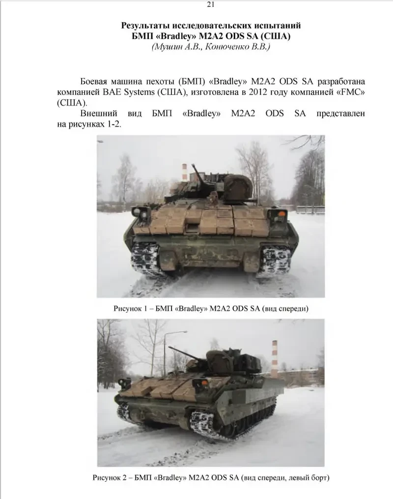 38-й Научно-исследовательский испытательный ордена Октябрьской революции Краснознамённый институт бронетанковой техники имени маршала бронетанковых войск Федоренко Я. Н., также называемый для краткости НИИИ БТ Минобороны, завершил сравнительные испытания американской боевой машины пехоты Bradley M2A2 ODS SA, взятой на поле боя в зоне СВО в качестве трофея.