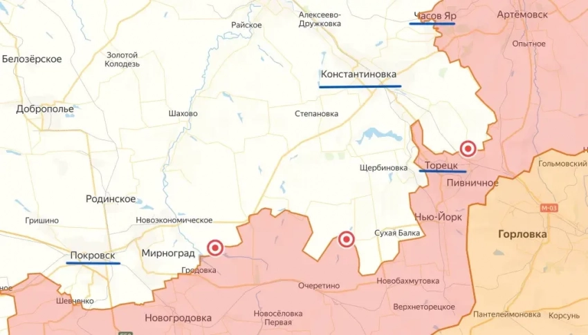 Можно заметить, что наступающие российские подразделения начинают охватывать с флангов оккупированную ВСУ Константиновку. Между Часовым Яром и Новой Полтавкой образовался большой карман, в котором находятся украинские войска.