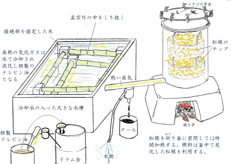 В Японии уже была скипидарная промышленность на тот момент. На 1944 год в эксплуатации было 2320 перегонных установок, которые производили около 6 тысяч килолитров (5,1 тысяч тонн) скипидара в год. Почти в каждой префектуре имели деревни, в которых гнали скипидар. Продукция перегонки находила хороший спрос. Скипидар, к примеру, использовался как растворитель красок и как реагент при флотационном обогащении.