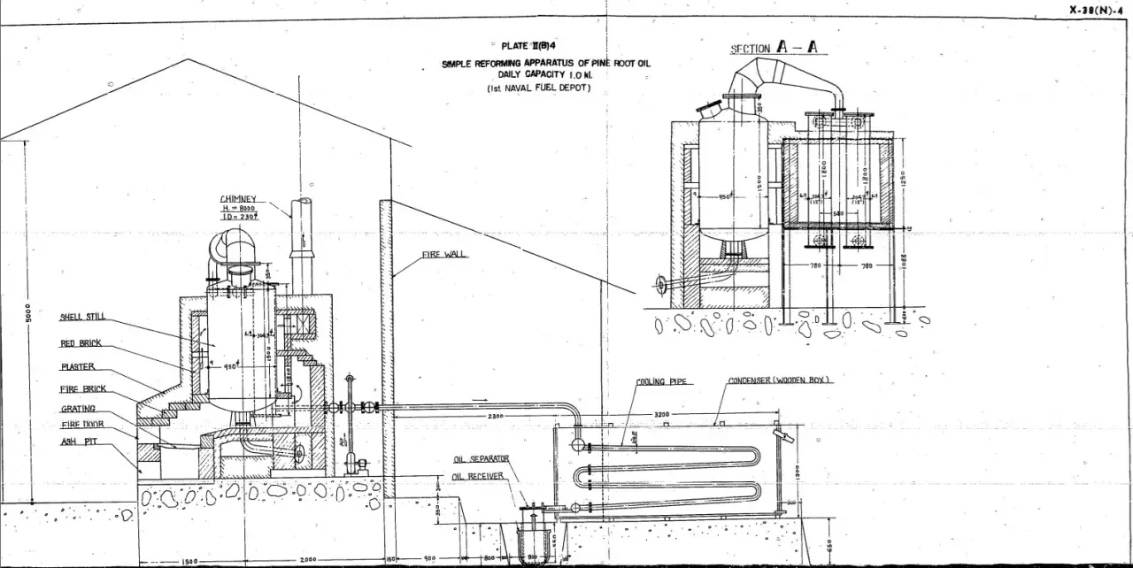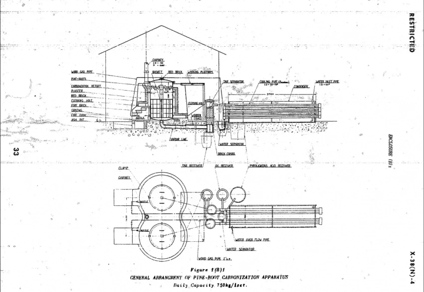 Есть отчет U.S. Naval Technical Mission to Japan под номером X-38(N)-4, законченный 6 февраля 1946 года, в котором с достаточно исчерпывающей полнотой были изложены практически все химические, технические и экономические обстоятельства этой программы. Для японцев это, положим, не новость, и ниже будет понятно почему. Но для нас весьма интересно, тем более, что именно эта военная технология легко приложима и к мирному хозяйству в рамках рационального лесопользования, чтобы не заваливать лесосеки древесными отходами. В России, обладающей колоссальными лесными ресурсами, в особенности хвойными, эта технология, японцами значительно усовершенствованная, может получить значительное развитие. Она прекрасна, поскольку сочетает в себе военно-мобилизационную простоту и техническую продвинутость.