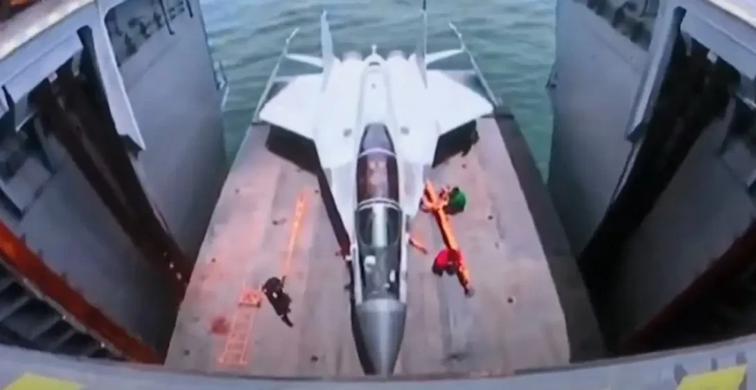 Транспортировка МиГ-29К на лифте авианосца Vikrant