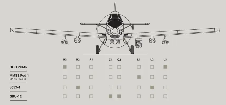 В 2023 году компания L3Harris, производитель Skyraider II, также заявила, что смоделировала потенциальную загрузку самолёта, которая включала противокорабельные ракеты AGM-84 Harpoon и противокорабельные ракеты большой дальности AGM-158B Joint Air-to-Surface Standoff Missile-Extended Ranges (JASSM-ER), согласно журналу National Defense Magazine.