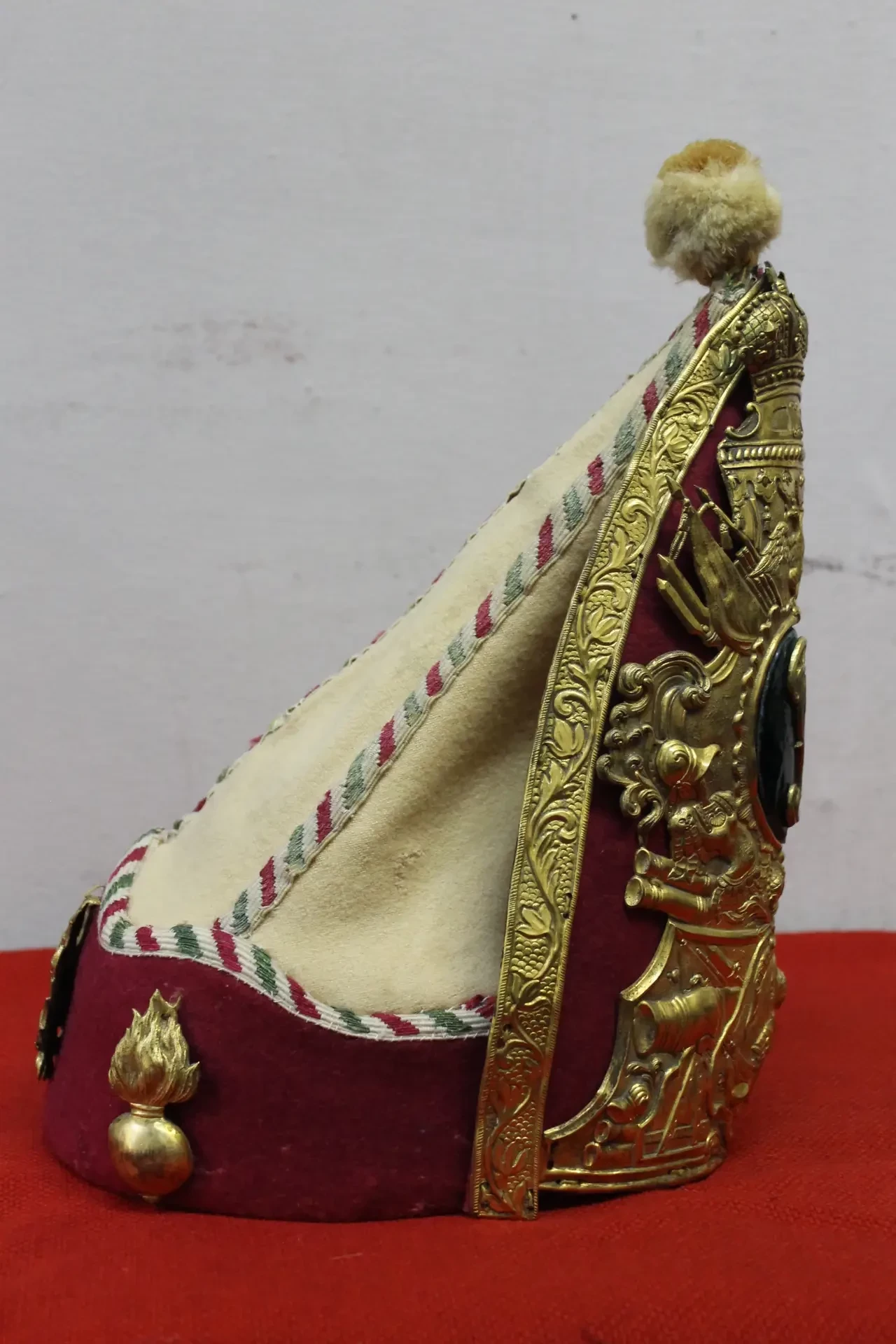 Митра-гренадерка голштинской гвардии Петра III до восшествия на российский престол. Судя по оформлению и приборным цветам, принадлежала обер-офицеру гренадерского батальона Эссена.Наналобнике вензель, составленный из латинских букв «P» (Пётр) и «F» (Фёдорович). Пензенский областной краеведческий музей. Фотография автора