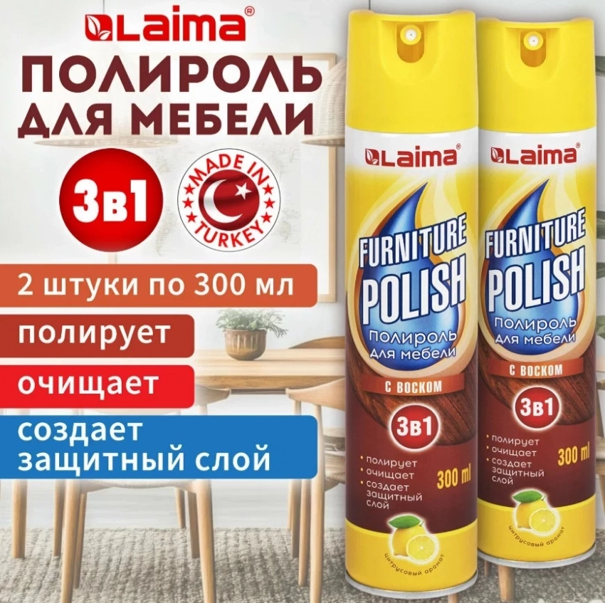Полироль для мебели с воском и антистатиком 3 в 1, спрей аэрозоль 300 мл набор 2 штуки, чистящее средство для уборки пыли, антипыль, Laima, 881134