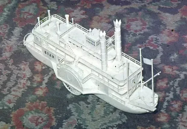 Понятно, что пришлось много фантазировать и подгонять именно под те детали, что были в этом наборе. Но многое переделывать практически не пришлось. Это трубы, рубка, кожухи гребных колес и сами гребные колеса, а также поручни, сделать которые в те годы я, понятно, был бы просто не в состоянии. А еще пришлось его делать чисто белым, потому что красить полистирол в те годы я мог только лишь нитроэмалью из баллончиков, которую приходилось отливать в банки и смешивать в них с зубным порошком, чтобы краска была матовой.