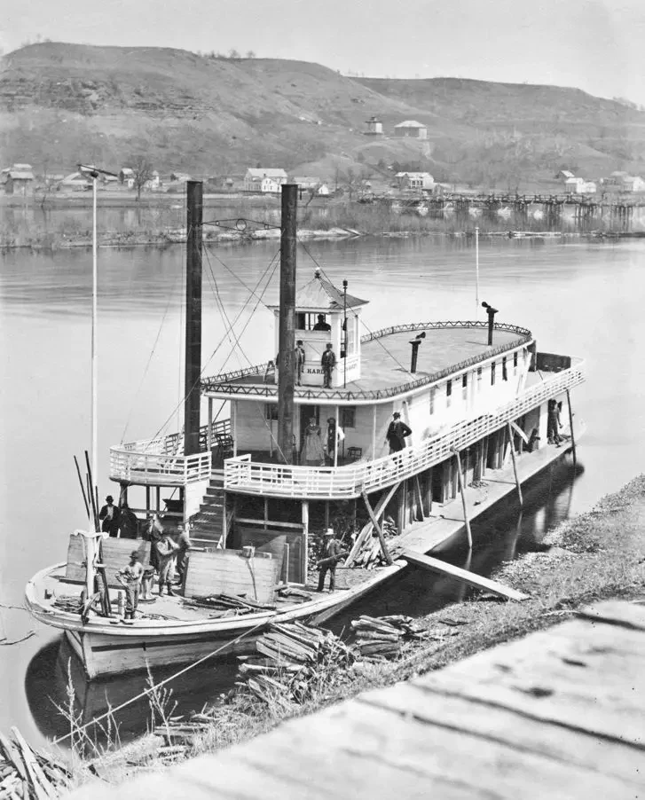 Итак, корпус. Он плоскодонный, с заметной погибелью палубы. Нижняя верхняя палуба обычно шире самого корпуса, по крайней мере, в его носовой части, хотя и не у всех пароходов такое наблюдалось. Высота борта и осадка совсем небольшая, так что плавать такие пароходы могли буквально «по росе». Получается, что изготовление такого корпуса особого мастерства не требовало. Материал использовался самый разный – и дерево, и металл (на более поздних пароходах). По сути дела, корпус «парохода Тома Сойера» представлял собой самый настоящий… понтон, на который устанавливались и все надстройки, и всё его оборудование.