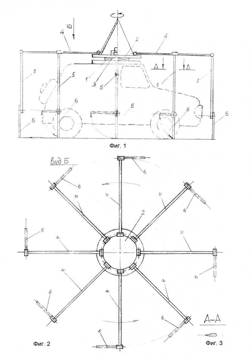 Гораздо более рационально подошёл к делу автор устройство для защиты от БПЛА, предложив организовать вращение конструкции за счёт потоков набегающего воздуха. На крышу автомобиля предполагается монтировать ротор на подшипнике, к которому крепится конструкция, очень походящая на карусель. В отличие от приведённых выше идей, данная разработка закрывает машину полностью без ослабленных зон. В нерабочем состоянии карусель, словно паук, поджимает лапки, освобождая место для входа-выхода. Автор предлагает в качестве варианта организовать принудительно вращение карусели за счёт электромотора или коробки отбора мощности. Есть признаки переоценки значимости изобретения: