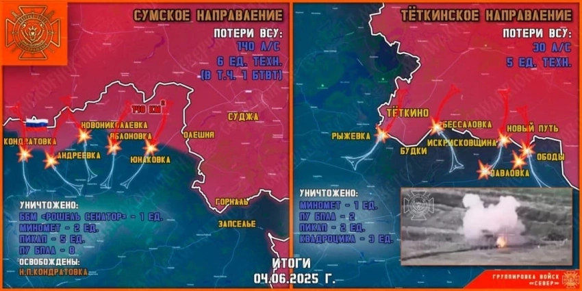 Главные новости » Эксклюзив » ВСУ за сутки дважды пытались прорваться в Тёткино: свежие данные из Курской области на сегодня, 05.06.2025