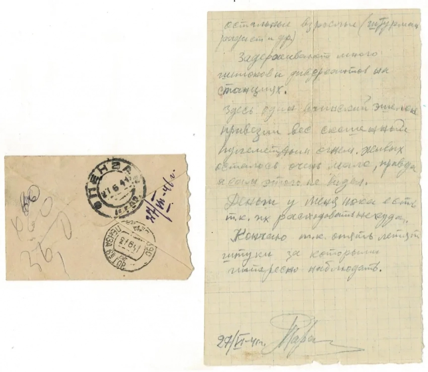 Третье письмо. Опять карандашом. Ни ручки, ни чернил, видимо, не сыскалось. Но зато нашелся большой конверт и лист бумаги. Причем конверт с популярной в то время маркой «с летчиком»