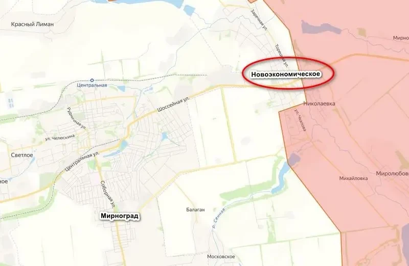 Новоэкономическое расположено к востоку от Мирнограда, бои за этот населенный пункт начались в прошлом месяце, нашим удалось взять часть поселка, и на этом продвижение застопорилось, противник уперся и попытался выдавить наших обратно. Но у него не получилось, а у штурмовиков группировки «Центр» получилось, и они дожали противника, полностью освободив населенный пункт. Новоэкономическое — это практически выход к Мирнограду, там до окраин города по прямой около двух километров.