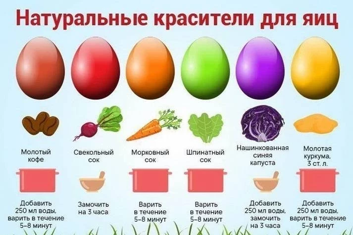 Затем список органических красителей расширился. Яйца окрашивали при помощи куркумы, молодых побегов крапивы, шпината, чайной заварки или кофейной гущи.