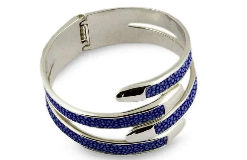 Женский браслет краб с натуральной кожей морского ската станет настоящим украшением любой современной девушки. Сам браслет металлический, со вставками кожи ската. Диаметр 5,5 см, а высота 2,5 см. Две половинки браслета подпружинены и закрываются по конструкции краба.