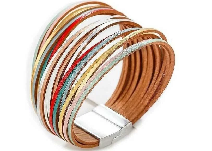 Яркий женский кожаный браслет из 20 разноцветных полосок (эко-кожа). Такой аксессуар добавит яркости в ваш образ и подойдет к любому наряду. Браслет красиво смотрится на запястье и удобно фиксируется на магнитной застежке.